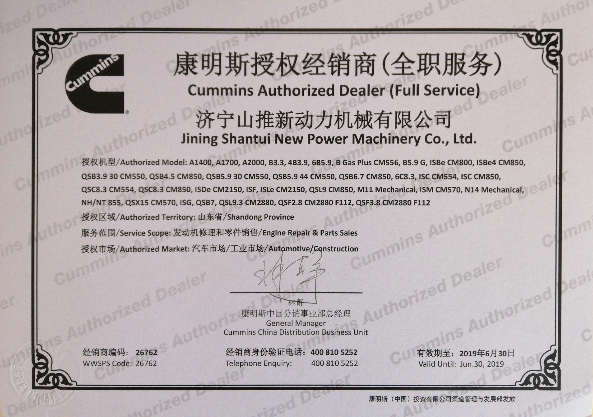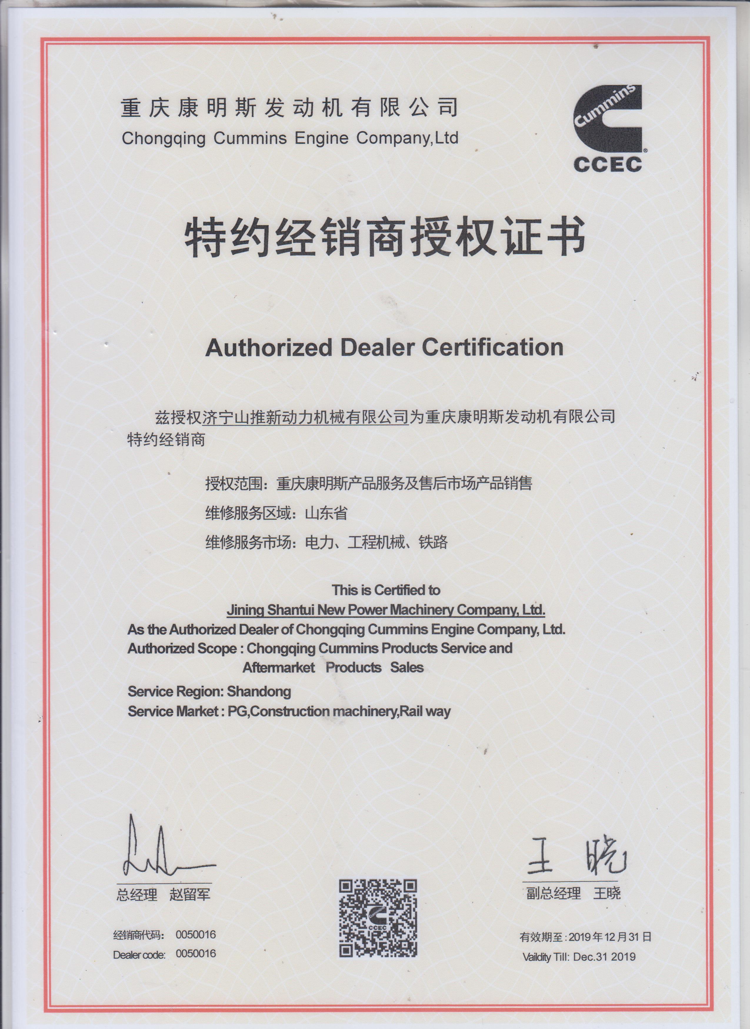 2018年康明斯授權證書